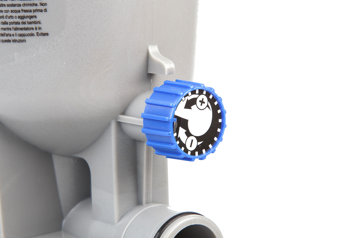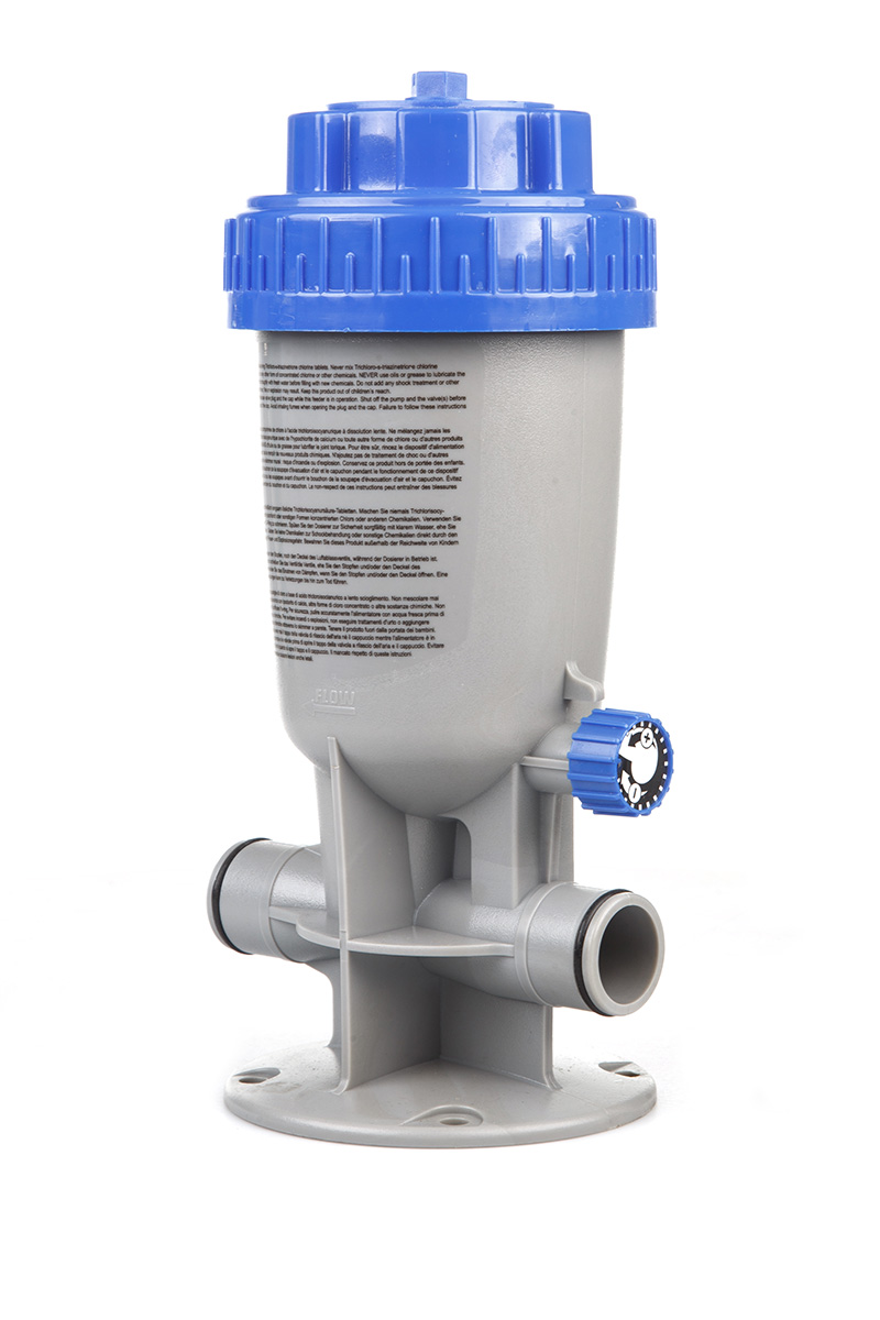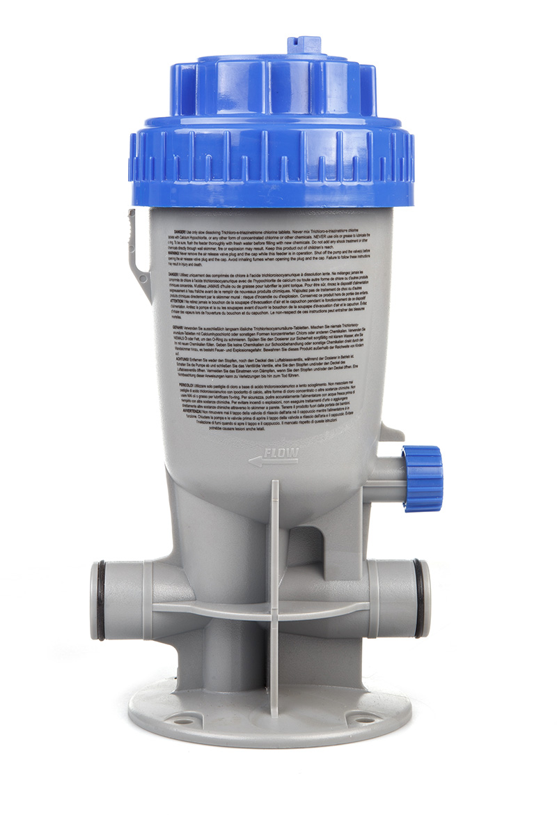 Chlorynator to bardzo przydatny dodatek do niewielkich basenów ogrodowych. Znacząco ułatwia regulowanie poziomu chloru w wodzie. Zasada działania dozownika chloru jest bardzo prosta: wystarczy wpiąć go w obieg wody (najlepiej przy wydajności pompy do 3785 L/h), a następnie uzupełnić zbiornik tabletkami chloru. Chlor jest uwalniany stopniowo, dzięki przepływającej wodzie. Chlorynator został wyposażony w pokrętło, którym możemy regulować dawkę chloru.