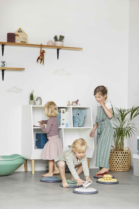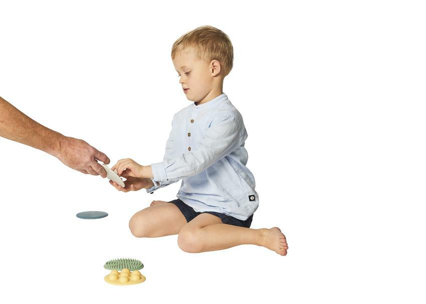 W zestawie dostępne są duże i małe dyski, można je wykorzystywać na różne sposoby, zwiększając lub zmniejszając poziom trudności zabawy, np. duży dysk dziecko dotyka stopami i rękoma odszukuje mały o tej samej strukturze.