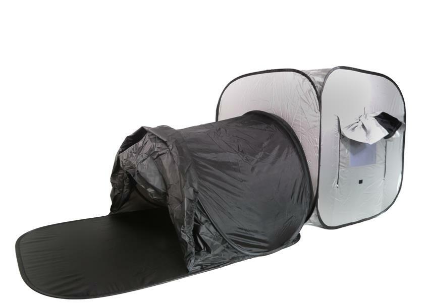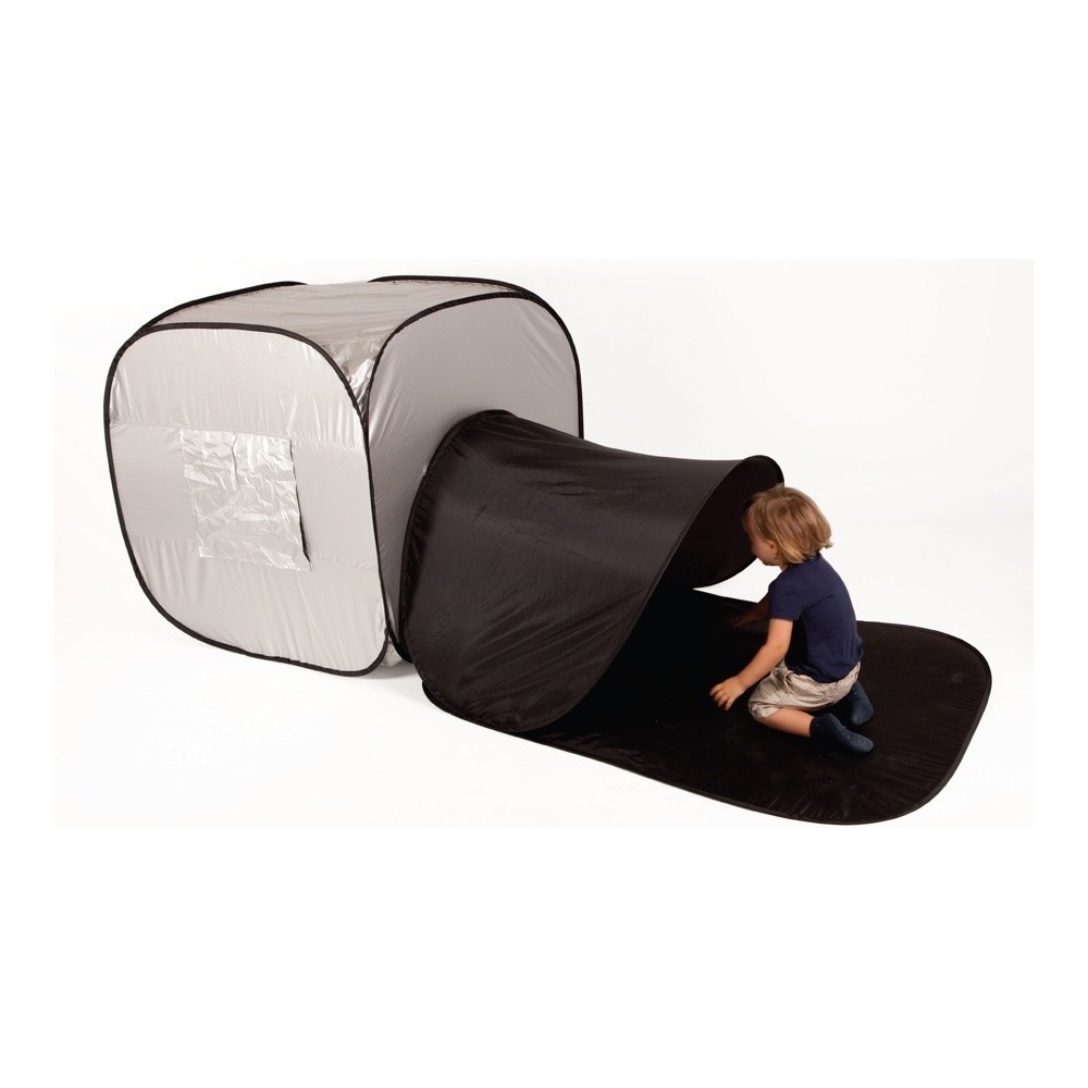 Domek sensoryczny świetnie sprawdzi się zaznajamianiu dzieci z ciemnością. Ściany jaskini wykonane zostały z podwójnego nylonowego materiału, dzięki czemu do środka nie dostaje się światło. Jaskinia pozwala w łatwy sposób stworzyć miejsce wyciszenia. Do domku sensorycznego znakomicie nadadzą się świecące zabawki do sal doświadczania świata. Jaskinia sensoryczna bardzo łatwo się składa i po złożeniu można ją trzymać poza salą zabaw.