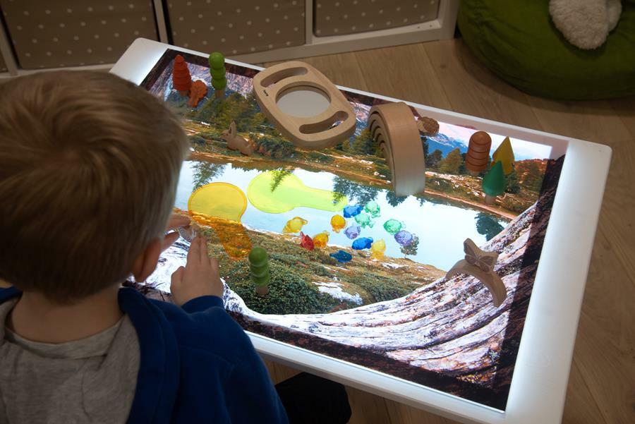 Mata do zabawy została zaprojektowana tak, aby pasowała do świecącego panelu LED. Ze względu na swoje półprzezroczyste właściwości mata szczególnie dobrze sprawdza się na panelu świetlnym lub innym świecącym stole, ponieważ światło będzie prześwitywać, oświetlając obrazy na macie. Wybrane źródło koloru będzie miało różny wpływ na wygląd maty: zmieniając niektóre kolory scenerii, intensyfikując kolory, a nawet sprawiając, że niektóre kolory będą sprawiać wrażenie fluorescencyjnych. Jest to fascynujący sposób odkrywania kolorów podczas zabawy.