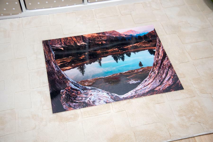 Mata do świecącego stolika LED, z szczegółową fotografią przedstawiającą jezioro otoczone drzewami oraz widokiem niebieskiego nieba. Mata stanowi doskonałą bazę do tworzenia pomysłowych zabaw na świecących stolikach oraz innych przestrzeniach. Idealnie łączy się z drewnianymi figurkami oraz transparentnymi elementami które są dostępne do kupienia w naszym sklepie.