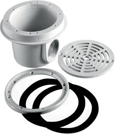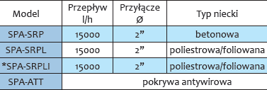 Wykonane z białego ABSu. Okrągła pokrywa z plastiku o średnicy 186,5 mm, mocowana za pomocą śrub ze stali nierdzewnej. Model SPA-SRPLI zawiera zestaw montażowy i śruby.Opcjonalnie standardowy grill można zastąpić pokrywą antywirową, chroniącą przed zapowietrzeniem pompy. W zależności od wariantu, odpływ nadaje się do montażu w każdej niecce basenowej.Tabela: