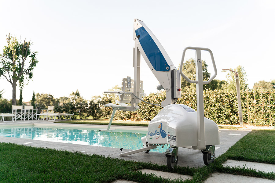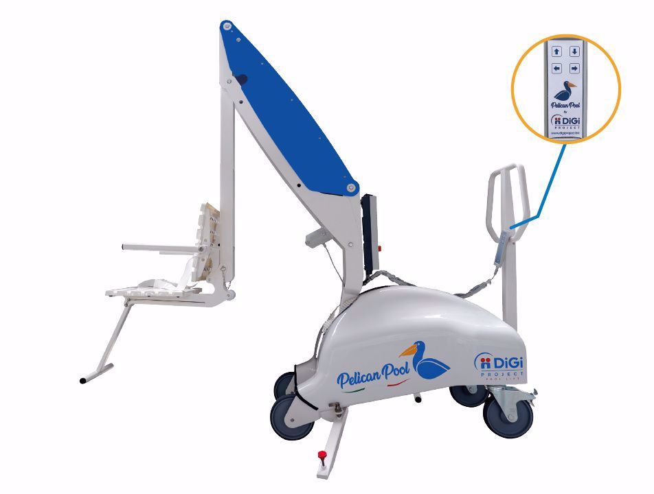 PELICAN POOL to najnowszy model włoskiego producenta firmy DiGiProject gwarantujący osobom ograniczonej sprawności ruchowej ułatwiony dostęp do basenu. Zaawansowana technicznie budowa podnośnika pozwala na likwidację bariery architektonicznej w postaci murku przy krawędzi basenu o maksymalnej wysokości 50 cm. Ponadto, dzięki praktycznemu systemowi obracania siedziska, użytkownik może w pełni samodzielnie wykonywać operacje wchodzenia i wychodzenia możliwy obrót ramienia o 90 stopni w prawo lub lewo. Proces obrotu oraz podnoszenia i opuszczania siedziska odbywa się z pozycji osoby znajdującej się na fotelu podnośnika i sterowane jest za pośrednictwem pilota.