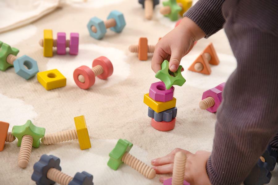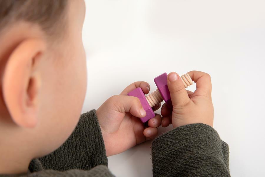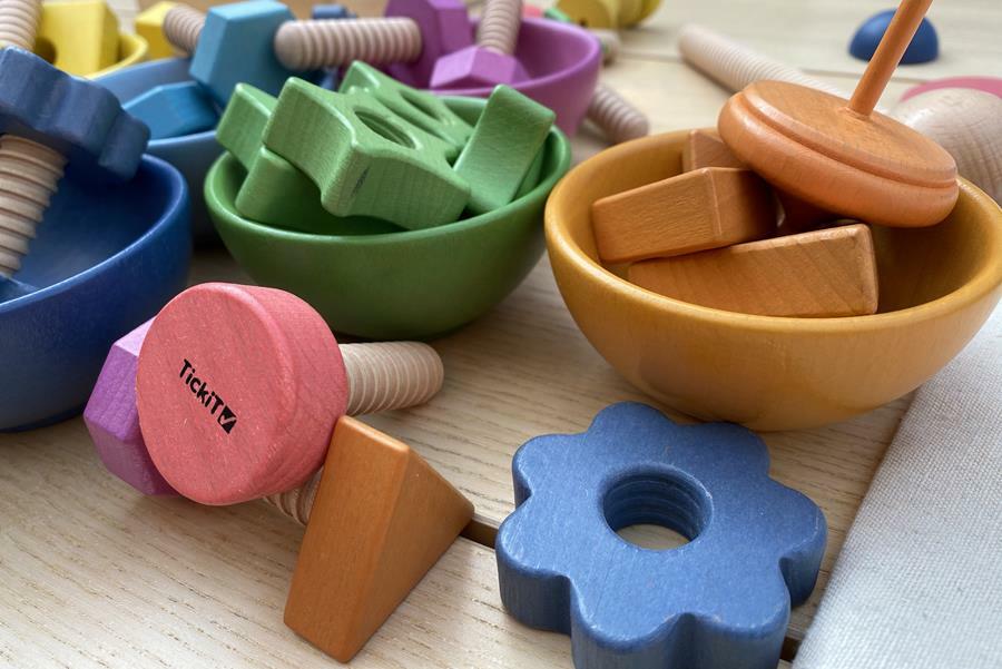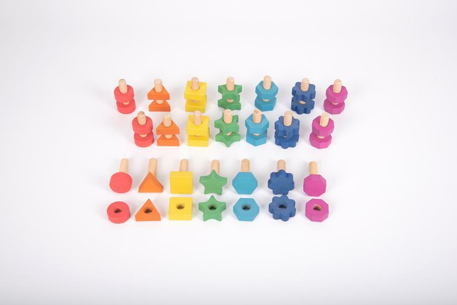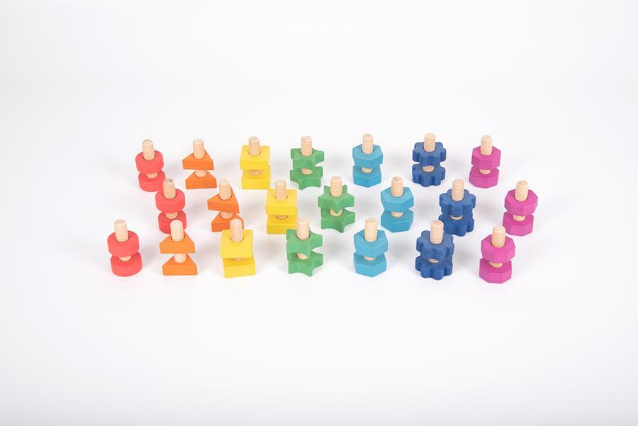 Tęczowe drewniane nakrętki i śruby z litego drewna bukowego w siedmiu różnych kształtach i  kolorach. Każda nakrętka ma odpowiednią śrubę do łączenia według koloru i kształtu. Grube elementy mają idealny rozmiar do zabawy przez małe dzieci. Idealnie sprawdzą się do nauki kolorów i kształtów, liczenia, a także do doskonalenia zręczności manualnej i małej motoryki. Zawiera bawełnianą torbę do przechowywania ze sznurkiem. Zestaw jest kompatybilny z tęczowymi drewnianymi ludzikami dużym oraz małym zestawem, co zapewnia jeszcze większe możliwości zabawy.