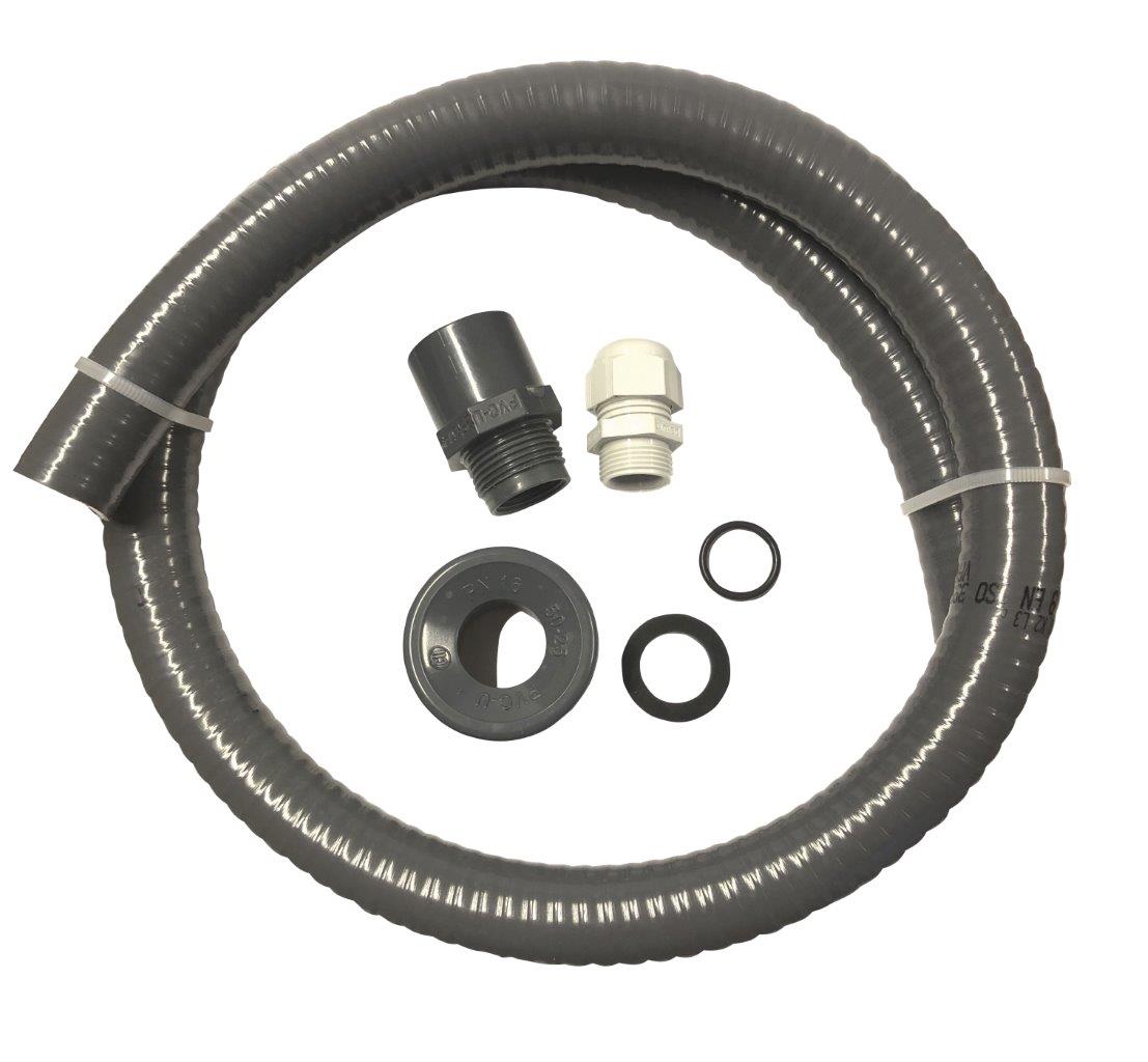 W skład tego rozwiązania wchodzi giętka rura wykonana z PVC o średnicy 50 mm, komplet redukcji oraz uszczelek i dławików. Pozwala szczelnie doprowadzić przewód od ściany niecki do puszki przyłączeniowej.