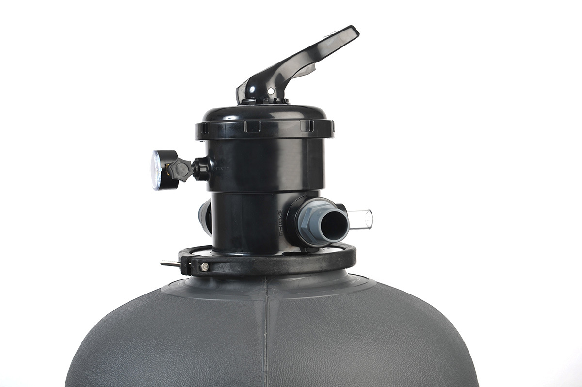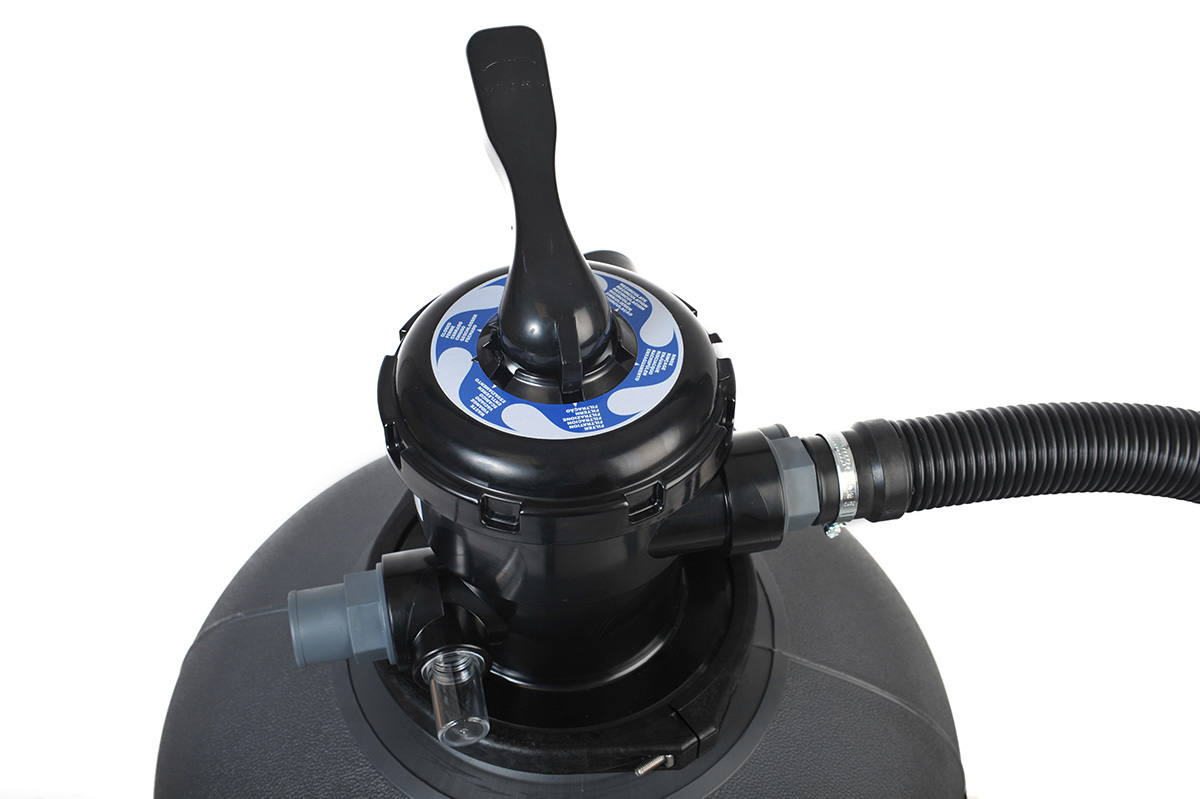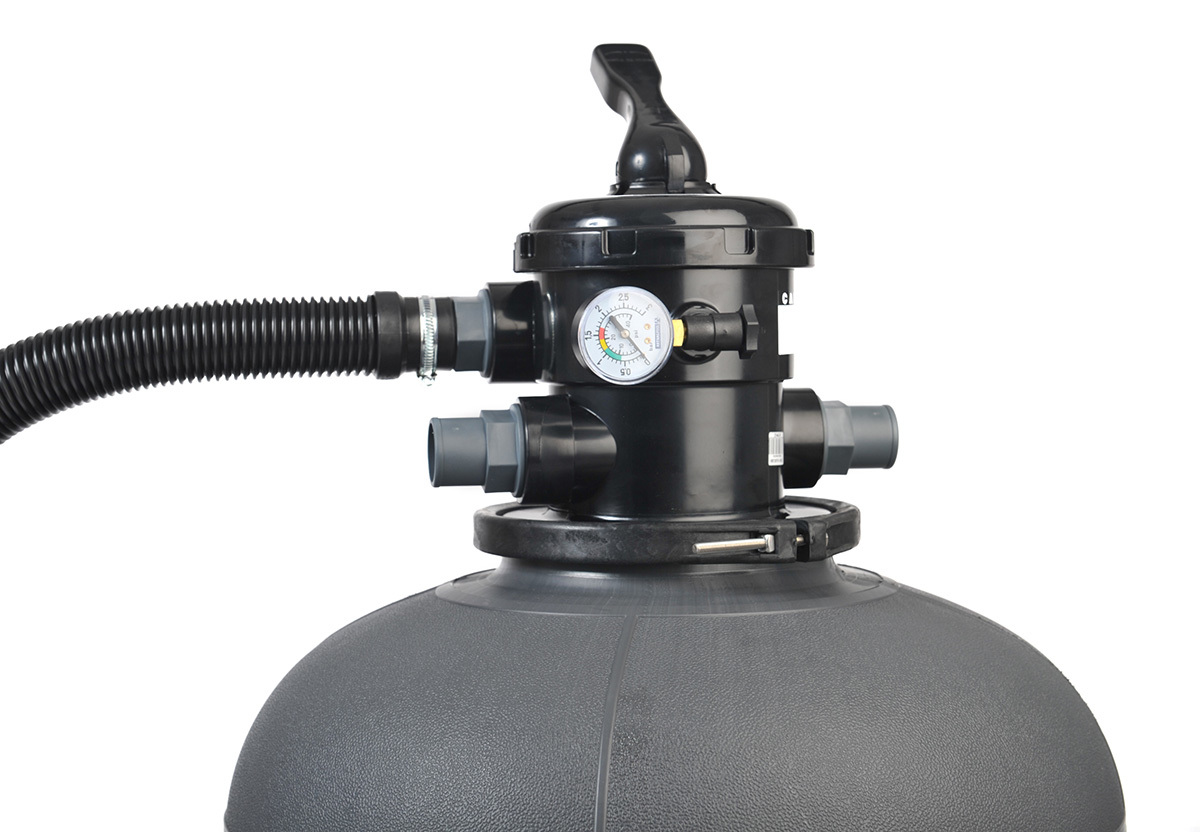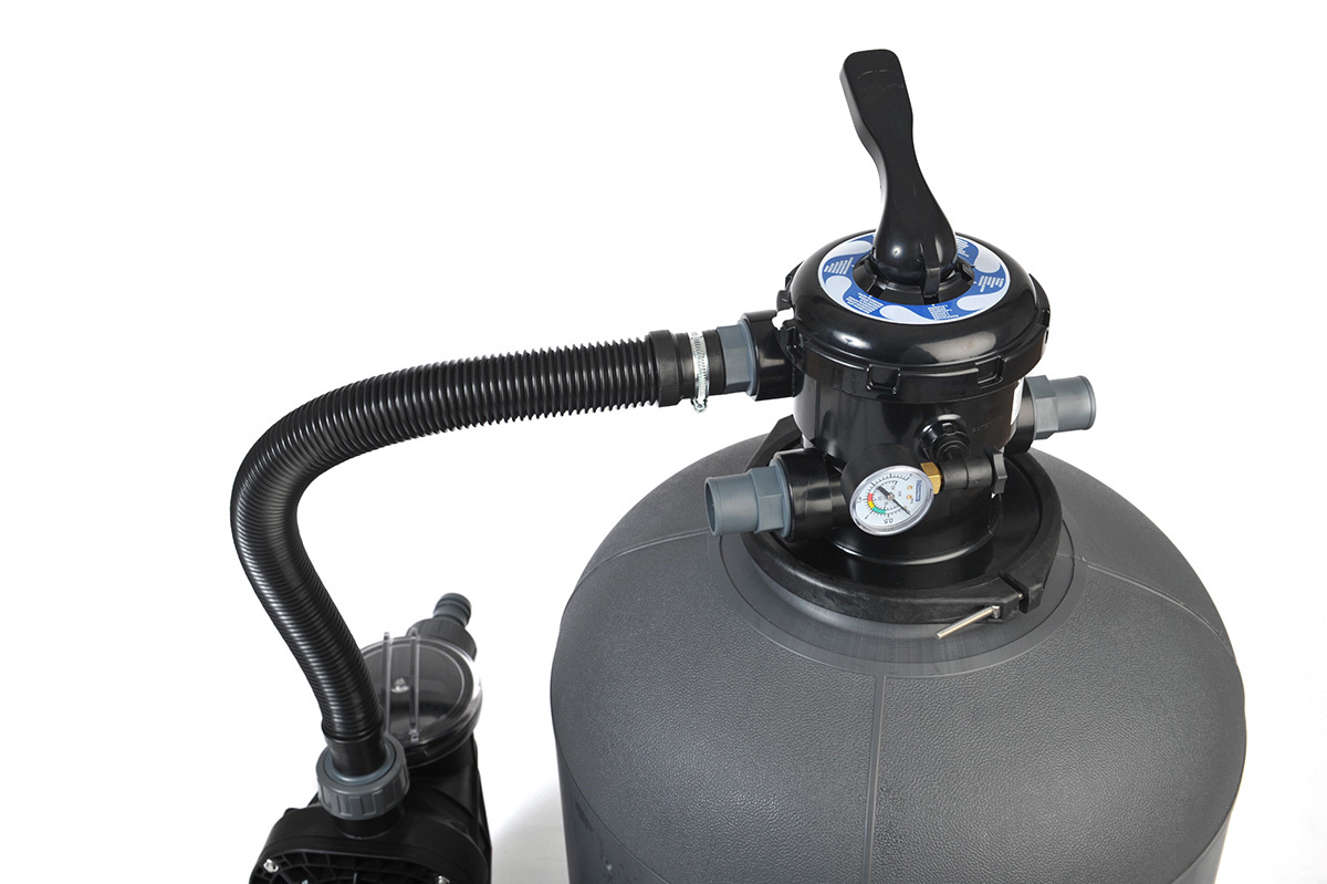 Gotowy układ do basenu odpowiadający za filtrację wody basenowej. Wyposażony w pompę, filtr oraz zawór 6-drogowy.