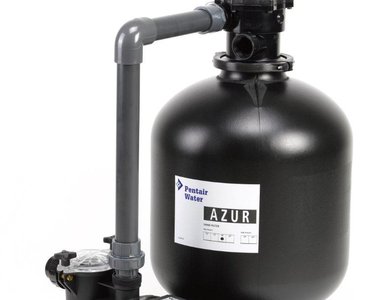 Filtr piaskowy Pentair AZUR, zamontowany jest na bazowej płycie. Zbiornik został zrobiony z polipropylenu, posiada 6-drożny zawór z manometrem i wziernikiem. W zestawie znajduje się również samozasysająca pompa PREVA lub Bettar Top. Średnica rur łączonych to 50 mm.