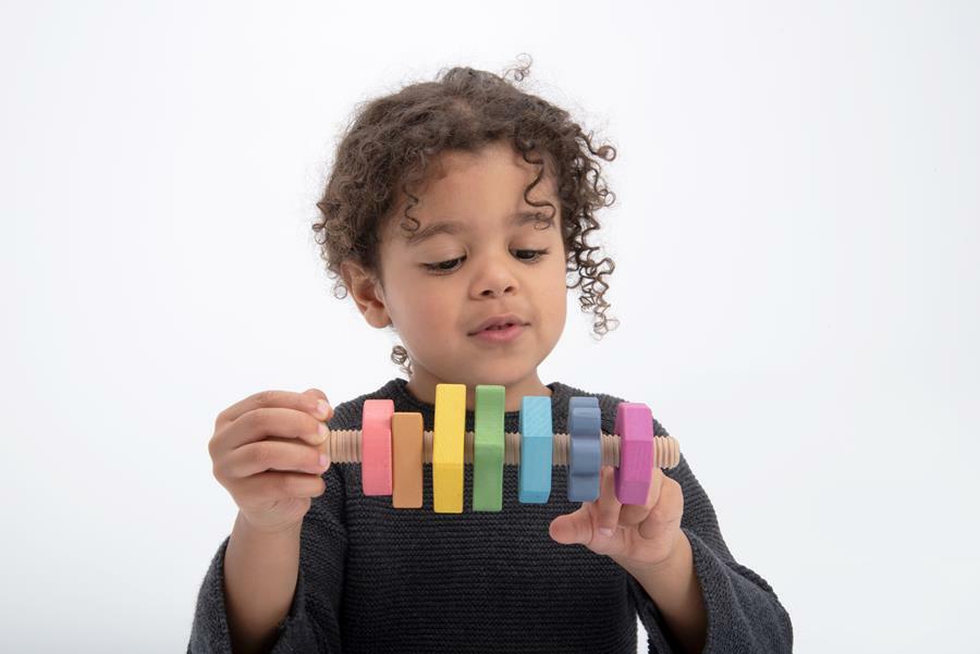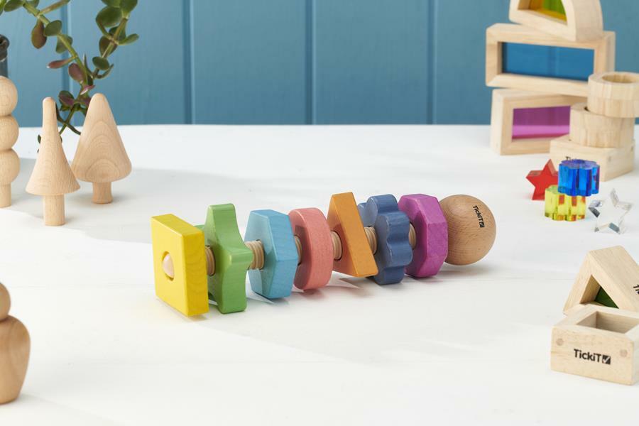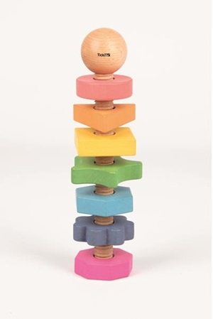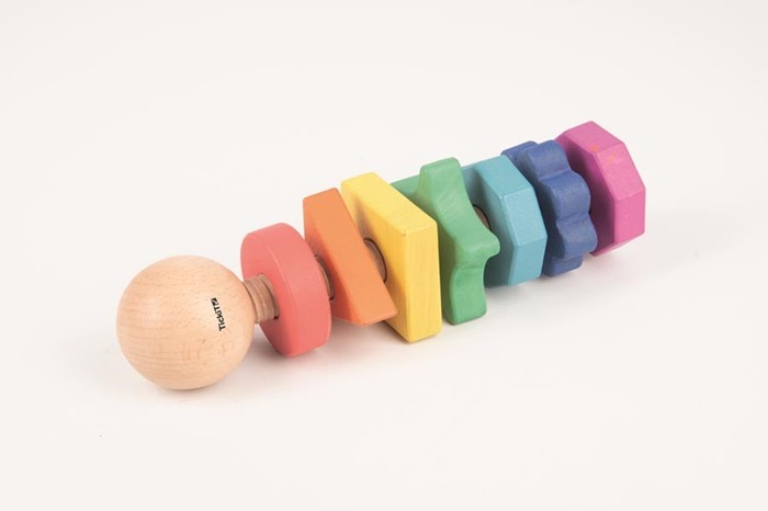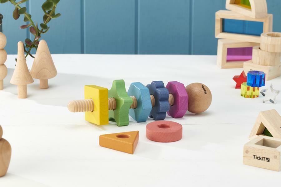 Drewniana śruba z litego drewna bukowego, z tęczowymi nakrętkami w różnych kształtach. Grube kawałki mają idealny rozmiar, aby małe dzieci mogły się nimi bawić. Idealne do nauki kolorów i kształtów, a także do doskonalenia zręczności manualnej i małej motoryki. Kolory pasują do tęczowych drewnianych nakrętek i śrub, dzięki czemu można ich używać wspólnie lub dowolnymi zabawkami, co zapewnia rozszerzoną wyobraźnię.