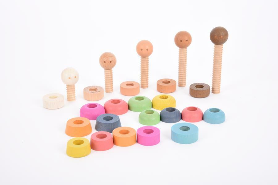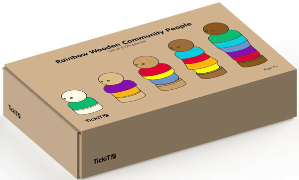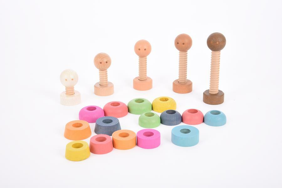 Zestaw figurek ludzi z gładkiego drewna bukowego o różnych odcieniach skóry. Figurki składają się z 5 głów w kolorze skóry na gwintowanych korpusach, dodatkowych 15 wsuwanych ubrań w tęczowym kolorze i 5 „nóżek” w kolorze skóry, które przykręca się, aby zabezpieczyć elementy na miejscu. Dzieci mogą łączyć i dopasowywać mankiety do głów i stóp, tworząc ciała o różnych kształtach i kolorach. Idealny do zabaw w świat, rozmów o rodzinie i społecznościach, poznawania podobieństw i różnic, rozwijania języka opisowego oraz doskonalenia umiejętności motorycznych i koordynacji ręka-oko. Zawiera bawełnianą torbę do przechowywania ze sznurkiem.